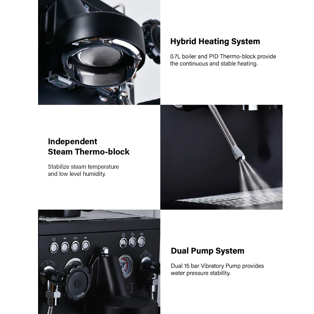 - Hybrid heating system: A 0.7L boiler, combined with the advanced PID thermoblock, ensures continuous and stable heating, providing precise temperature control for consistent brewing temperatures, resulting in perfect espresso extraction every time.