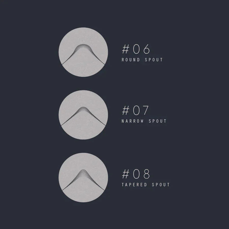 Drawing on years of expertise in spout shape design, our collaboration has resulted in the creation of a groundbreaking offering:Â the high precision tapered spout #08. This spout mirrors the finesse of a fine-tipped pen, making it ideal for intricate combination pours, particularly in a drag and draw style. With a tipped lip ensuring a graceful downward flow, this spout introduces a new level of precision to your latte art.